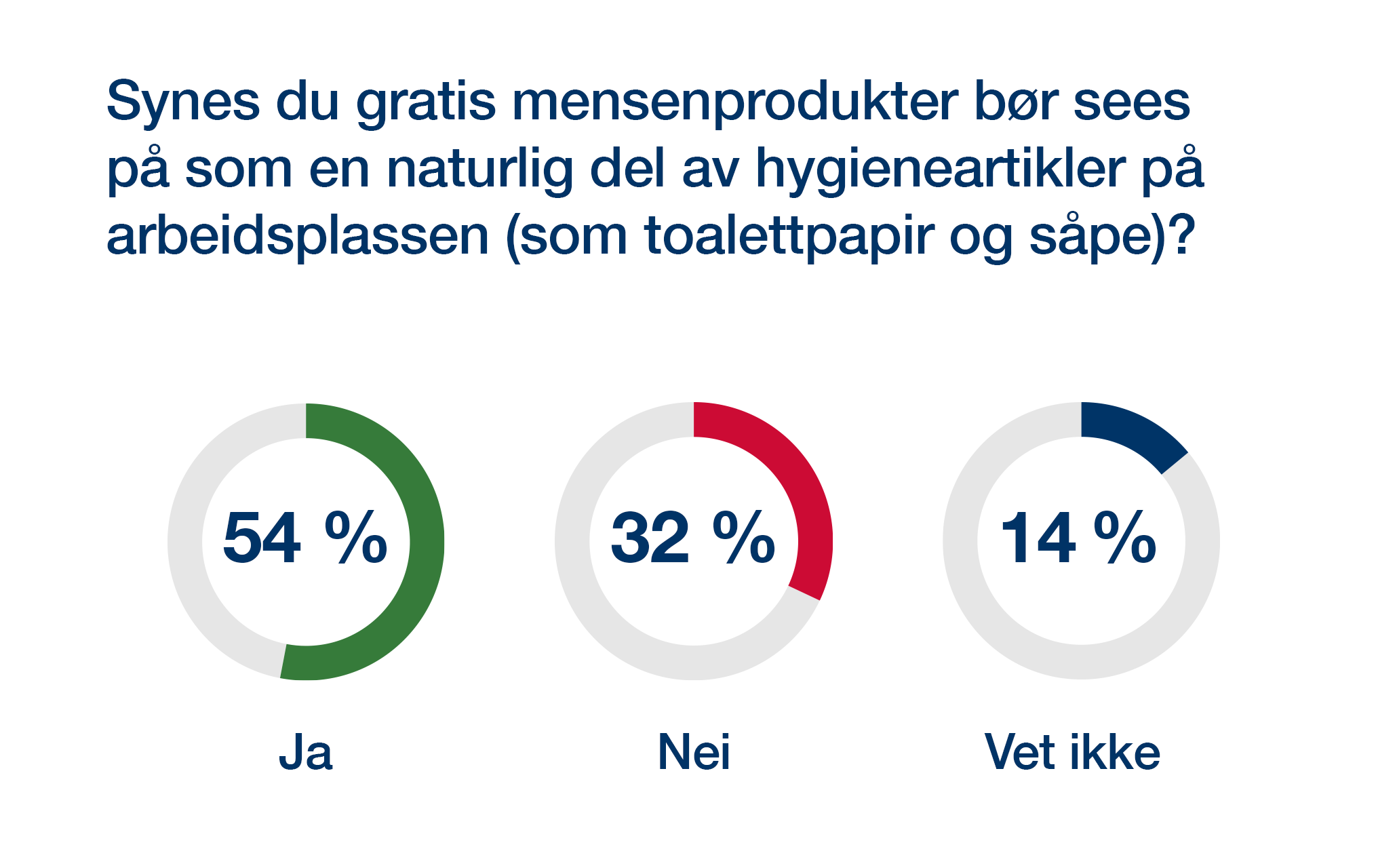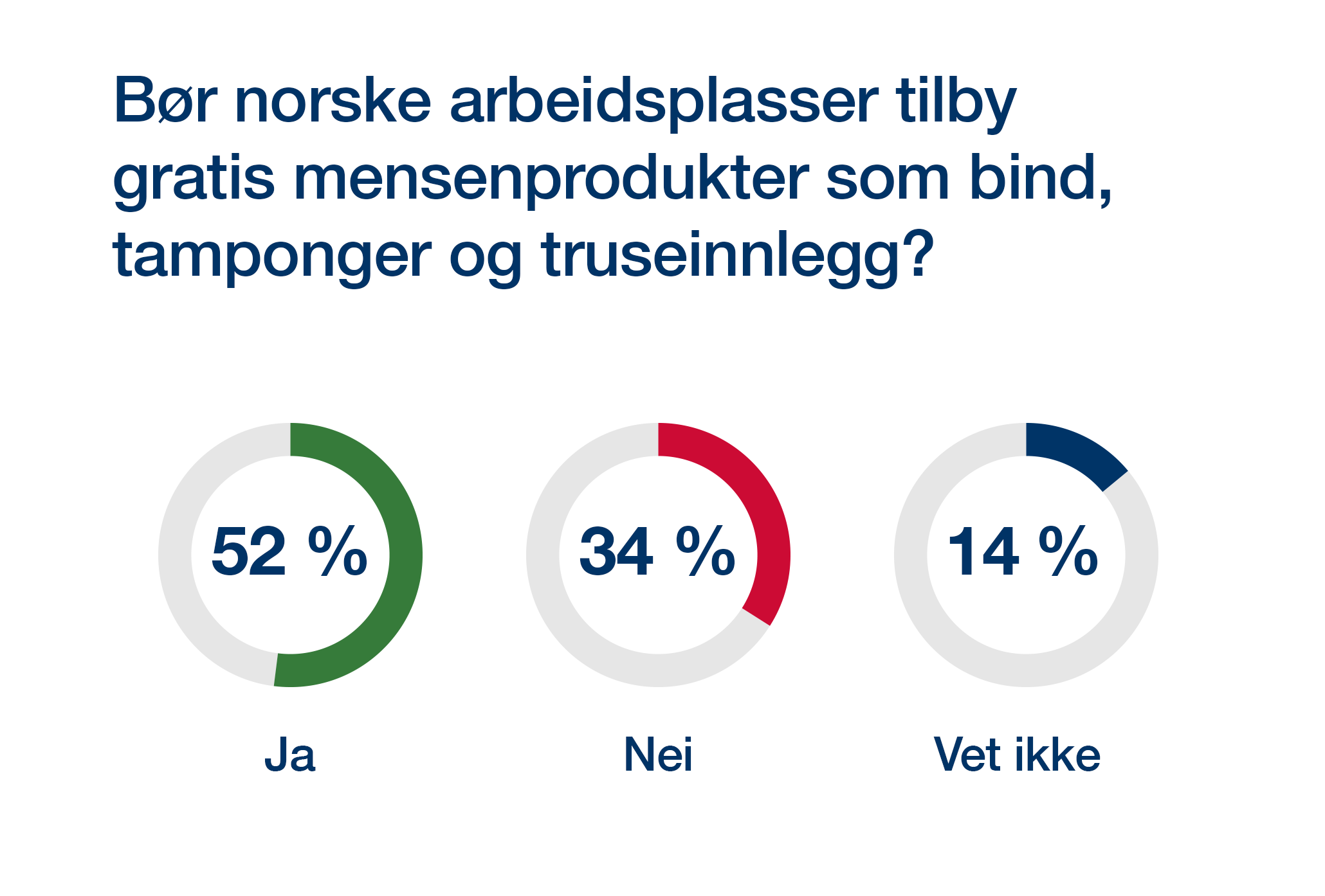 52 % mener det er viktig at arbeidsgiver tilbyr gratis mensenprodukter som bind, tamponger og truseinnlegg.